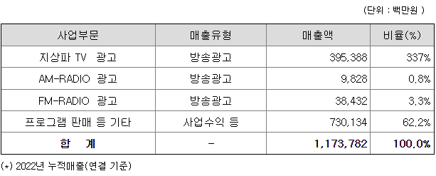 당사의 주요사업은 지상파를 근간으로 하는 콘텐츠 제작, 지상파 플랫폼 광고사업과 콘텐츠유통사업입니다. 광고사업은 TV, 라디오 광고와 협찬으로 구성되어 있습니다. 프로그램 판매 등의 콘텐츠유통사업은 고퀄리티의 지상파 콘텐츠를 해외 및 국내 OTT, IPTV, 케이블TV, 위성방송 등에 판매하고 있습니다.