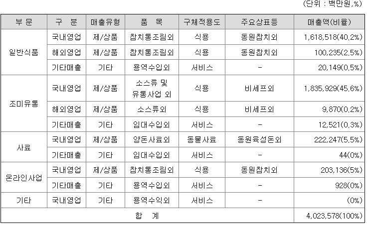 조미유통부문은 '국민 건강을 최고의 가치로 삼아 새로운 식생활과 식문화를 선도해 최고의 고객 가치를 창출한다'는 경영이념 아래 식자재유통, 외식, 급식, KIDS 경로 등의 유통 사업을 영위하고 있으며, B2B 조미식품 분야에서 입지를 확실하게 다져오고 있습니다. 또한 '의식동원(醫食同原: 밥이 곧 보약이다)',즉 '고객들에게 보약을 다려주듯 최상의 재료로 최상의 급식을 제공한다'는 슬로건을 내걸고 고객의 보다안전한 식문화를 선도하는 데 앞장서고 있습니다.