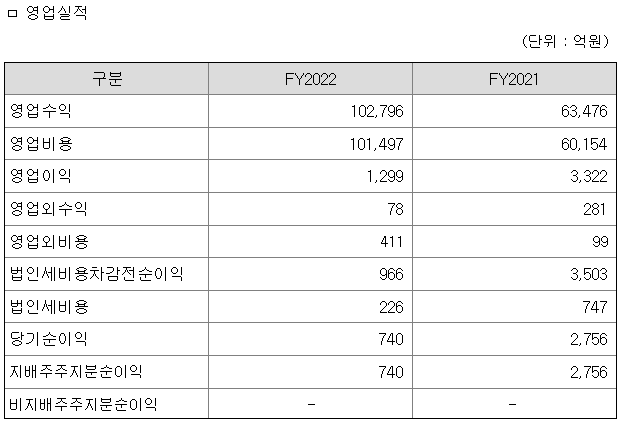 우크라이나 사태, 고유가, 금리환경 변화 등에 따른 국내외 금융시장불안 속에서 당사의 2022년 연결기준 지배주주지분순이익은 740억원을 기록하였습니다. 같은기간 영업이익은 1299억원을 기록하였으며, 영업수익(매출액)은 10조2796억원을 기록하였습니다.