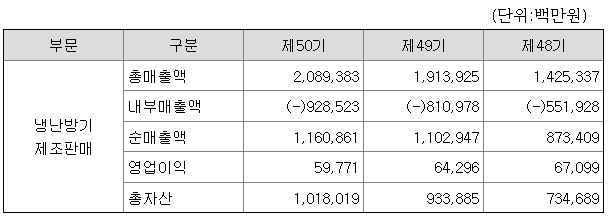 이와 더불어 Premium 보일러 등 다양한 신제품 출시를 통해 소비자 요구에 부합하는 제품 Line-Up과 중대형 보일러 수요를 대체하는 Cascade 통합관리시스템, 실내공기질 관리를 위한 TAC(Total Air Care) 사업을 통해 지속적인 시장 점유율 확대 및 매출 신장이 기대됩니다.