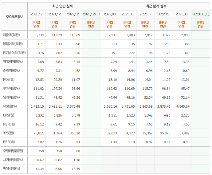 2022년 실적은 1조 1609억, 영업이익은 598억입니다. 그리고 영업이익률은 5.15%입니다.