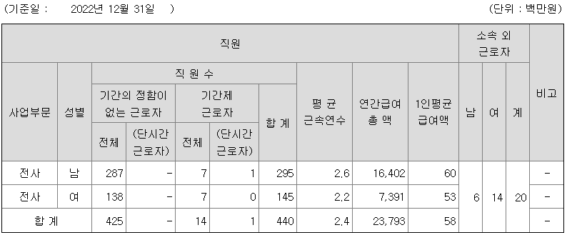 | 사업부문 | 성별 | 직원수 | 평균근속연수 | 평균연봉(백만) |