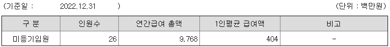 미등기임원의 평균연봉은 4억 400만원이고 직원수는 26명입니다.
