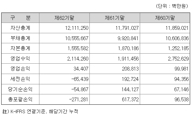 당사의 제62기말 연결기준 총자산은 12조 1,112억원으로 전기말(제61기말, 2021년 12월말) 대비 2.7% 증가하였으며 자본총계는 1조 5,556억원으로 전기말 대비 16.8% 감소하였습니다.