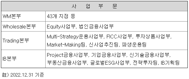 당사는 금융투자업의 주된 사업영역인 주식/채권 등의 유가증권 중개, 펀드/신탁/랩 등 각종 금융상품의 개발 및 판매, 고객 포트폴리오 설계 등의 자산관리업무(WM 및 Wholesale)와 자기자본 투자, 고객상품 운용과 같은 트레이딩업무(Trading), 유가증권 인수주선, M&A자문, PF 등의 투자은행업무(IB) 등을 아래의 영업부문에서 영위하고 있습니다.