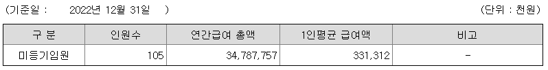 미등기임원의 평균연봉은 3억 3100만원이고 직원수는 105명입니다.
