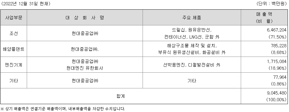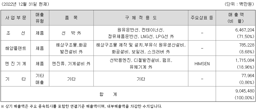 엔진기계사업은 선박의 추진/발전기용 엔진이 주요 제품으로 조선산업과 밀접한 관련이 있습니다. 따라서, 조선 및 해운산업이 발달한 국가에 경쟁력 있는 엔진제조사가 밀집해 있습니다. 대형 선박(상선)의 주기관인 대형엔진은 MAN-ES(Man EnergySolutions)社와 WinGD(Winterthur Gas&Diesel)社의 제품이 양분하고 있으며, 당사를 비롯 엔진 제조사들은 Licensee로 엔진을 제작, 조선소에 납품하고 있습니다.