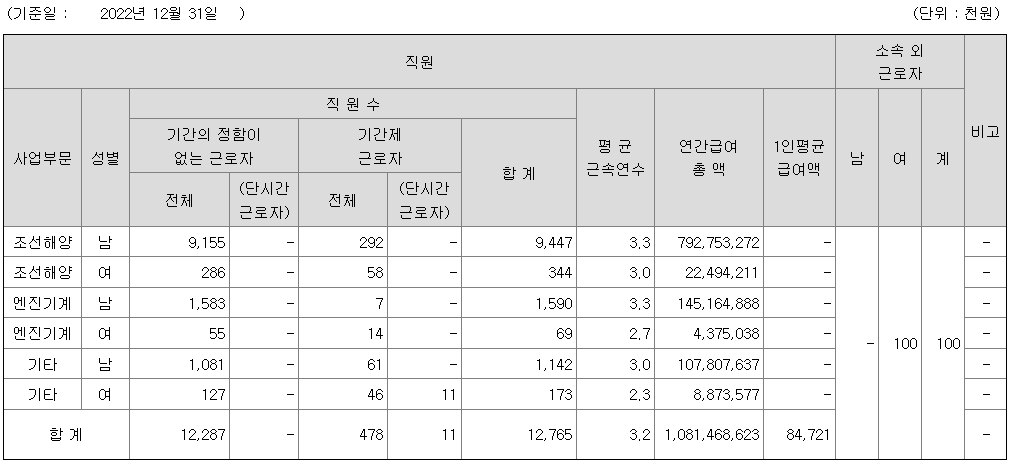 | 사업부문 | 성별 | 직원수 | 평균근속연수 | 평균연봉(백만) |