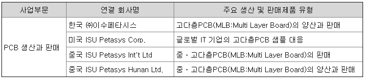 당사는 전자제품의 핵심부품인 인쇄회로기판(PCB)을 전문으로 생산하고 있으며, 한국 (주)이수페타시스(본사)에는 3개의 공장 및 연구소를 운영하고 있습니다.