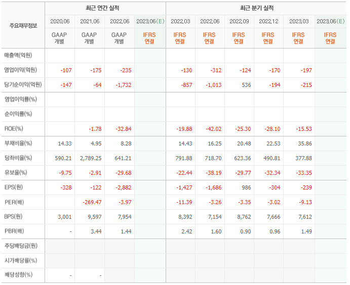 2022년 실적은 0원, 영업이익은 -235억입니다. 그리고 영업이익률은 0%입니다.