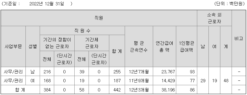 | 사업부문 | 성별 | 직원수 | 평균근속연수 | 평균연봉(백만) |