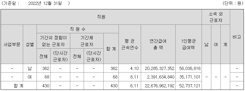 | 사업부문 | 성별 | 직원수 | 평균근속연수 | 평균연봉(백만) |