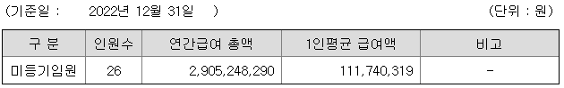 미등기임원의 평균연봉은 1억 1100만원이고 직원수는 26명입니다.