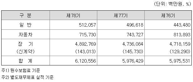 보험영업부문은 경과보험료 4조 8,938억원, 발생손해액 4조 450억원, 순사업비 1조 479억원으로 1,991억원의 손실을 기록하였으나 투자영업부문에서 6,128억원의 이익을달성하여 상기 금액의 흑자를 시현하였습니다.