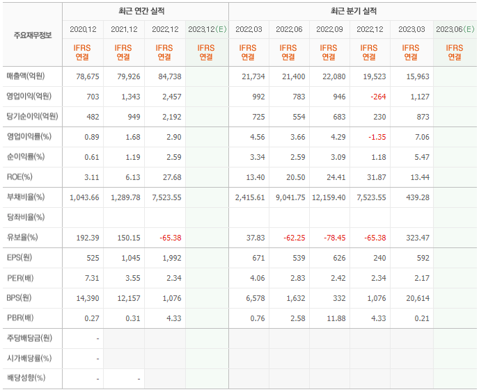 2022년 실적은 8조 4738억, 영업이익은 2457억입니다. 그리고 영업이익률은 2.90%입니다.