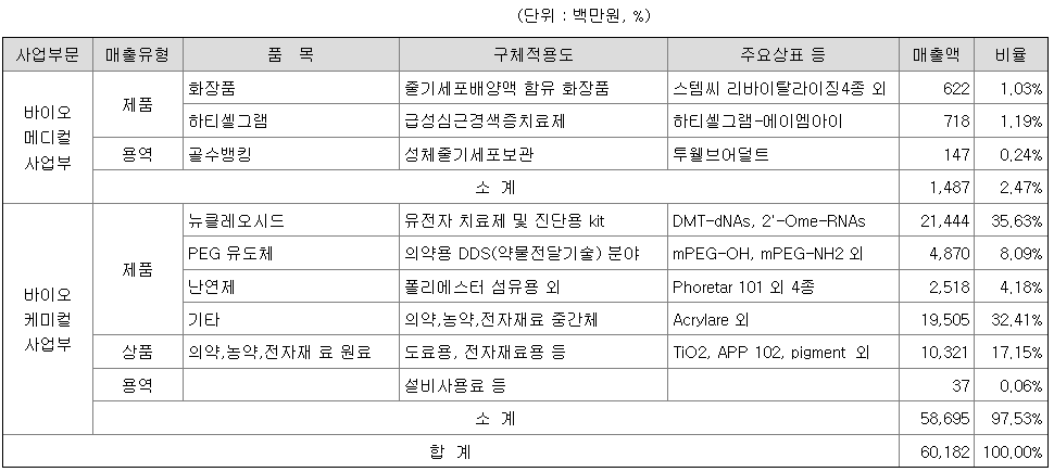 바이오메디컬 사업부는 줄기세포치료제 개발을 핵심사업으로 하며 치료제 개발 과정에서 축적한 다양한 노하우를 바탕으로 성체줄기세포 보관사업도 수행하고 있으며 줄기세포 배양기술을 응용해 줄기세포 배양액 추출물이 함유된 화장품을 개발해 판매하고 있습니다.