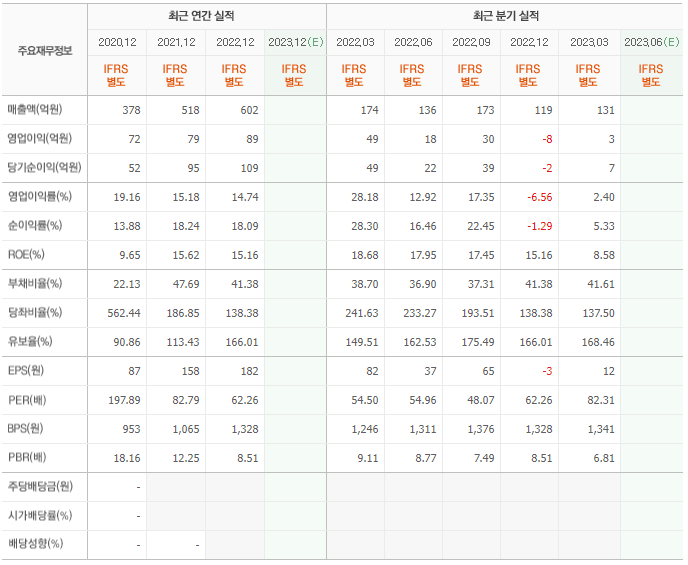 2022년 실적은 602억, 영업이익은 89억입니다. 그리고 영업이익률은 14.74%입니다.