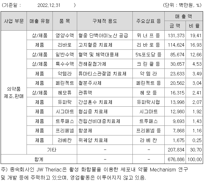 당사의 주요 제품은 수액제 등을 포함한 전문의약품으로 상위 10개 제품의 매출실적은 다음과 같습니다.