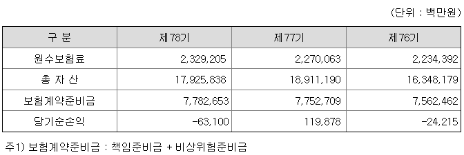 제78기 당사는 일반, 자동차보험의 질적 개선 및 장기보험 중심의 성장을 바탕으로 전년 대비 2.6% 성장한 2조 3,292억원의 원수보험료를 거수하였습니다. 보험종목별로는 일반보험은 전년 대비 24.6% 감소한 1,407억, 자동차보험은 24.3% 감소한 1,379억, 장기보험은 7.9% 성장한 2조 506억을 거수하였습니다. 총자산은 17조 9,258억을 기록하였으며, 장기보험 매출확대에 따른 일시적인 판매비 증가와 금융시장 여건 악화에 따른 금융자산 평가손실 등으로 인하여 631억원의 당기순손실을 기록하였습니다.