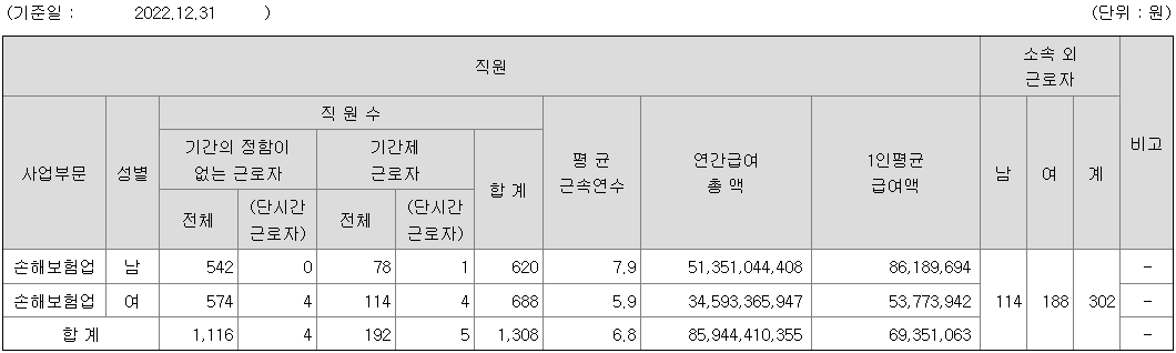 | 사업부문 | 성별 | 직원수 | 평균근속연수 | 평균연봉(백만) |