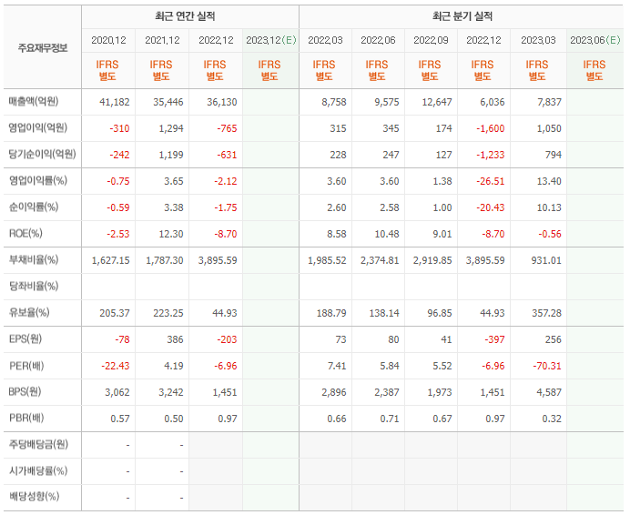 2022년 실적은 3조 6130억, 영업이익은 -765억입니다. 그리고 영업이익률은 -2.12%입니다.