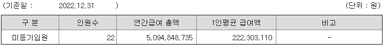 미등기임원의 평균연봉은 2억 2200만원이고 직원수는 22명입니다.
