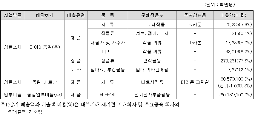 당사의 연결대상 종속법인은 12개 회사이며, 이 중 기업공시서식 작성기준에 의해 동일알루미늄(주), 동일-베트남 2개 회사가 주요종속회사의 요건을 충족하고 있습니다. 지배회사인 당사와 종속회사의 사업부문별 현황은 다음과 같습니다.