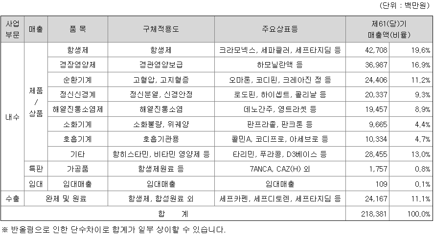 코로나19 영향으로 호흡기계 품목의 매출이 증가하였으며, 하모닐란 등 대형품목 및 파이브로 등 주요 자사 경구제의 매출 회복을 통하여 전년대비 294억원, 17.8%의 매출 성장을 달성하였습니다. 2023년은 자사 경구제 제품 성장 및 만성질환 제품 사업 확대를 통하여 이익 중심의 성과를 달성할 계획입니다.
