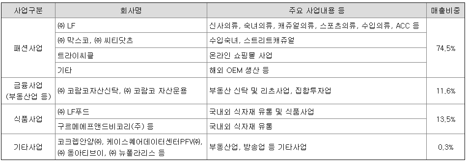 | 패션사업 | ㈜ LF | 신사의류, 숙녀의류, 캐쥬얼의류, 스포츠의류, 수입의류, ACC 등 |
