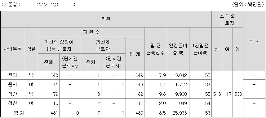 | 사업부문 | 성별 | 직원수 | 평균근속연수 | 평균연봉(백만) |