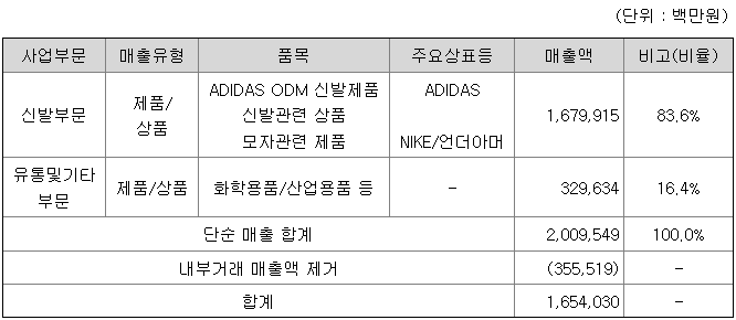 주요매출처인 신발부문은 신발관련 제상품과 모자관련 제품으로 매출이 구성되어있습니다. 신발관련 제상품은 매출처와 보장된 가격(수익율)보다 높은 수익의 창출을 위해 혁신을 통한 생산효율성 증가, 자동화설비 도입 등 을 통한 인당생산성 및 로스율 감소를 통해 아디다스와 협의된 Profit 이상의 이익을 창출하고 있습니다.