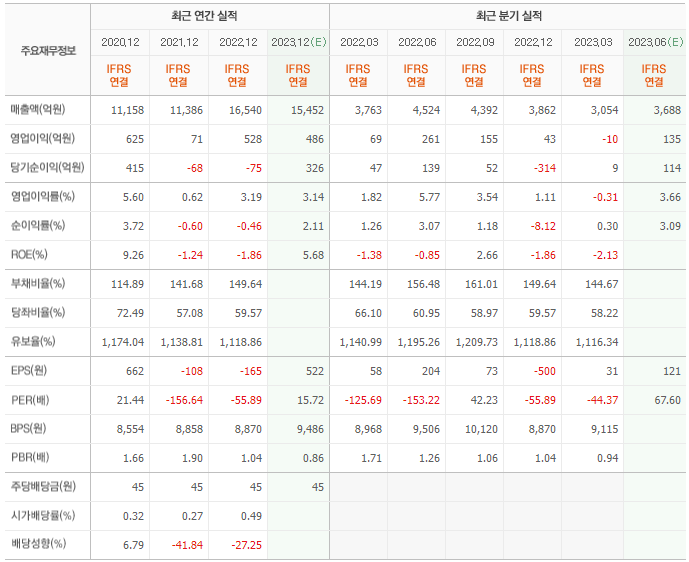 2022년 실적은 1조 6540억, 영업이익은 528억입니다. 그리고 영업이익률은 3.19%입니다.