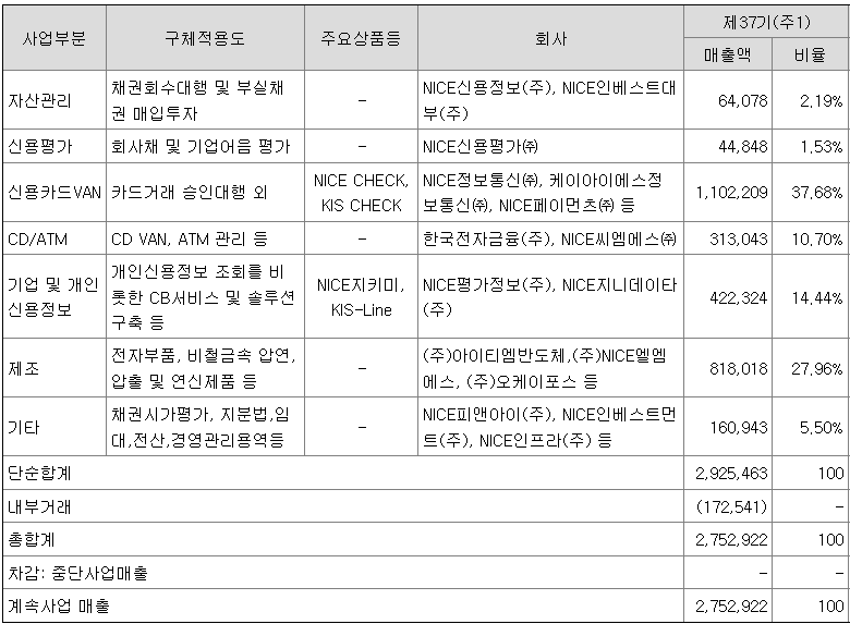 당사는 자회사의 주식 또는 지분을 취득, 소유함으로써 자회사의 제반 사업내용을 지배, 경영지도, 정리 육성하는 지주사업을 주된 사업으로 영위하고 있습니다. 당사는 종속회사(37개사)를 통하여 기업정보 및 개인신용정보사업, 신용카드거래승인과 현금영수증발행에 관한 정보처리와 기기를 유통하는 사업, CD/ATM 관리사업, 회사채 및 기업어음 등에 대한 신용평가사업, 제조업, 기타사업 등을 영위하고 있습니다.