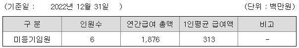 미등기임원의 평균연봉은 3억 1300만원이고 직원수는 6명입니다.