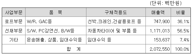 당사 및 연결종속회사가 영위하는 선재사업은 로프 부문, 선재 부문, 기타 부문(임대업 등)으로 이루어져 있습니다. 각 부문은 서로 다른 기술과 마케팅전략을 요구하기 때문에 별도로 운영되고 있으며, 보고기간말 현재 제조 및 판매하고 있는 각 부문별 주요 제품은 다음과 같습니다.