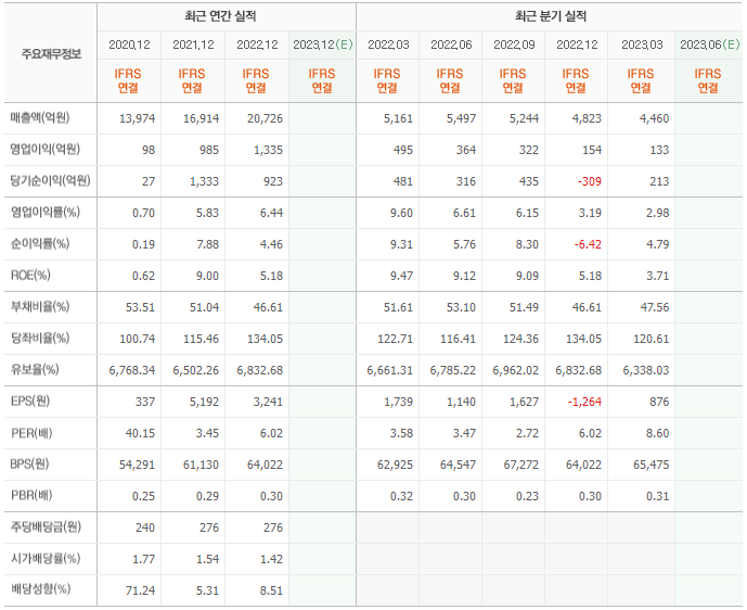 2022년 실적은 2조 726억, 영업이익은 1335억입니다. 그리고 영업이익률은 6.44%입니다.
