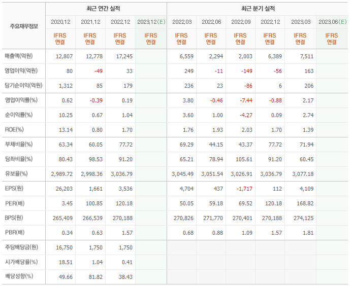 2022년 실적은 1조 7245억, 영업이익은 33억입니다. 그리고 영업이익률은 0.19%입니다.