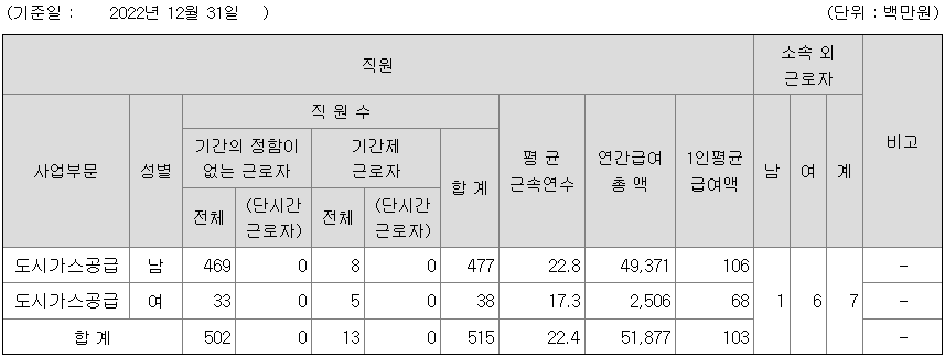 남성의 평균연봉은 1억 600만원이고 직원수는 477명, 여성은 6800만원이고 직원수는 38명입니다. 전체 평균연봉은 1억 300만원이고 직원수는 515명입니다.