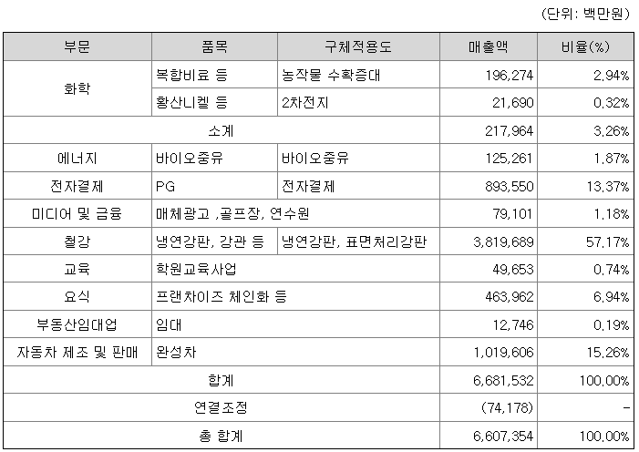 회사는 사업의 성격에 따라 10개 부문(화학, 에너지, 전자결제, 미디어 및 금융, 교육사업, 요식업, 철강 및 항만업, 부동산임대업, 자동차제조업, 기타)으로 구분하였으며사업부문별 현황을 요약하면 아래와 같습니다.