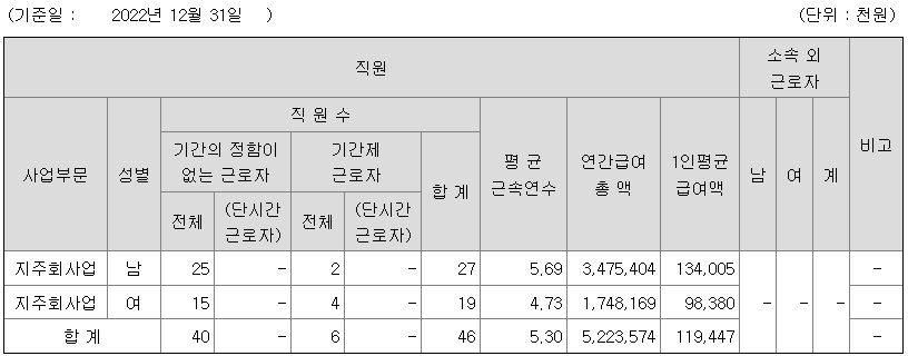 | 사업부문 | 성별 | 직원수 | 평균근속연수 | 평균연봉(백만) |