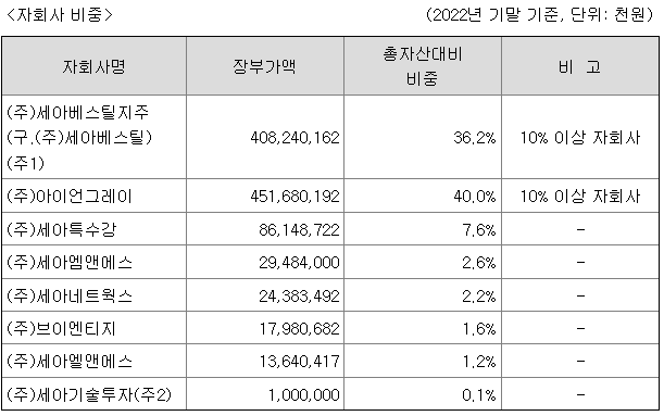 당사는 독점규제 및 공정거래에 관한 법률 상 기업집단 세아의 대표회사이며 2022년 12월 31일 현재 당사를 포함하여 총 28개의 국내계열회사를 가지고 있습니다. 이 중 당사를 모회사로 하는 국내 자회사는 (주)세아베스틸지주(구.(주)세아베스틸), (주)세아특수강, (주)아이언그레이, (주)세아엘엔에스, (주)세아엠앤에스 등 총 8개사입니다.