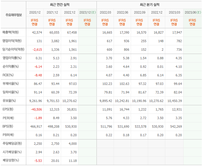 2022년 실적은 6조 7458억, 영업이익은 1961억입니다. 그리고 영업이익률은 2.91%입니다.