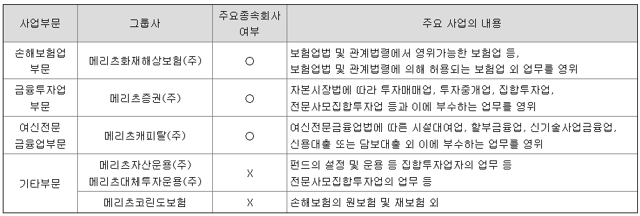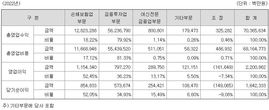 상기 구분에 따른 메리츠금융지주 연결기준의 사업부문별 영업성과 및 비중은 아래와 같습니다.