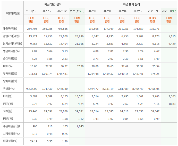 2022년 실적은 70조 3656억, 영업이익은 2조 2009억입니다. 그리고 영업이익률은 3.13%입니다.
