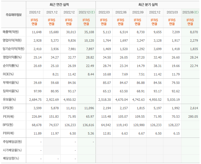 2022년 실적은 3조 13억, 영업이익은 9836억입니다. 그리고 영업이익률은 32.77%입니다.