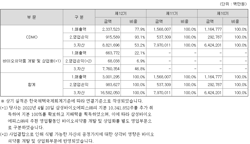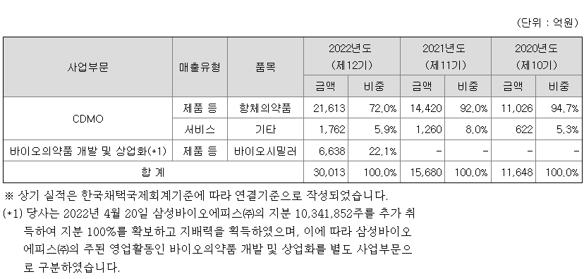 당사가 영위하는 사업은 CDMO부문과 바이오의약품 개발 및 상업화 부문으로 나뉘어져 있습니다. CDMO부문은 바이오의약품 위탁생산 및 세포주 공정 개발 서비스를제공하고 있으며, 바이오의약품 부문은 바이오의약품 개발 및 상업화를 목적으로 하고 있습니다. 당사는 2022년 4월 20일 삼성바이오에피스㈜의 주식 10,341,852주를 취득하여 당기말 지분율 100%를 보유함에 따라, 삼성바이오에피스㈜를 바이오의약품 개발 및 상업화 부문으로 구분하였습니다.