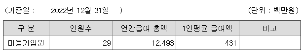 미등기임원의 평균연봉은 4억 3100만원이고 직원수는 29명입니다.