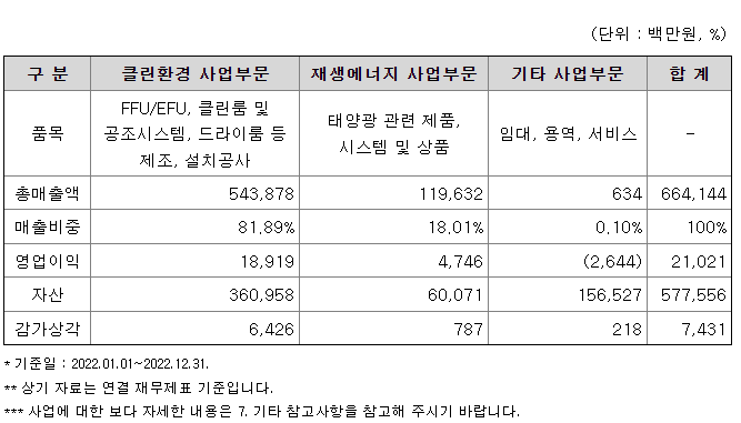 당사가 영위하고 있는 클린룸 사업은 반도체 및 평판디스플레이, 이와 관련한 소재 및 제품 등의 제조공간에 공기청정도를 제어하는 장비를 생산, 설치하는 사업으로, 클린룸 전체 설비 중에서 공기정화설비에 관련된 사업이며, 일반 빌딩 및 공장에 대한 공조 장비 제조 및 설치공사, 이차전지 생산시설의 드라이룸, 양극 공정에 필요한 장비(믹싱챔버, NMP 회수시스템, 하이브리드제습기 등)의 설치 공사를 포함하고 있습니다.
