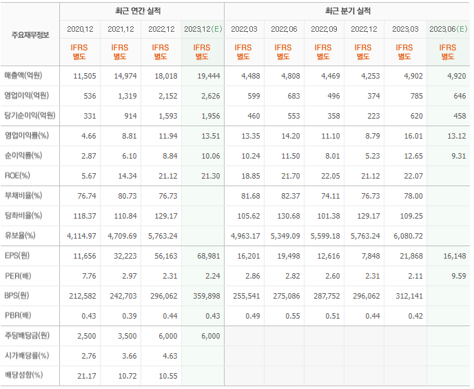 2022년 매출은 1조 8018억, 영업이익은 2152억, 당기순이익은 1593억입니다. 그리고 영업이익률은 11.94%입니다.