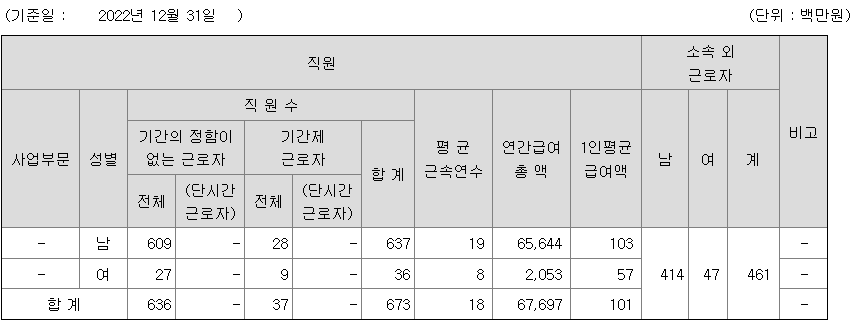 | 사업부문 | 성별 | 직원수 | 평균근속연수 | 평균연봉(백만) |